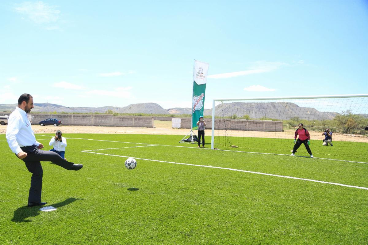 Adicionalmente, Alejandro Tello inauguró la cancha de pasto sintético de la unidad deportiva municipal, misma que dará servicio a 1 mil 254 deportistas, y que tuvo un costo de 5.5 millones de pesos, provenientes del Fondo Minero.