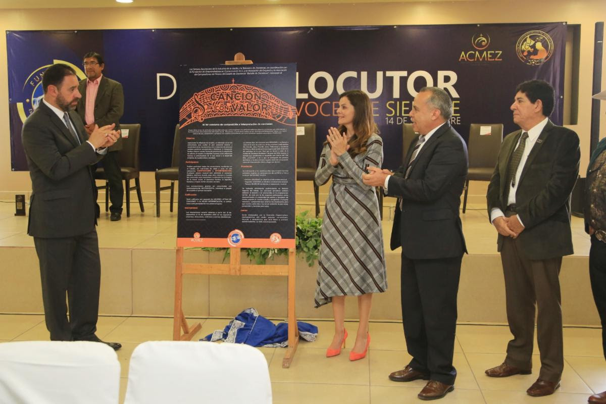 Durante el evento, el titular del Ejecutivo y el Presidente de la Fundación Emprendedores en Comunicación, Cliserio del Real, develaron el cartel de la convocatoria para el concurso de composición e instrumentación, el cual es abierto al público.