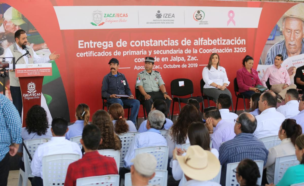 Los 905 certificados y constancias entregados este jueves en Apozol forman parte de los aproximadamente 13 mil que se otorgarán durante este año en todo el territorio estatal, gracias al dinamismo que ha impreso Carlos Peña Badillo, Director General del IZEA.