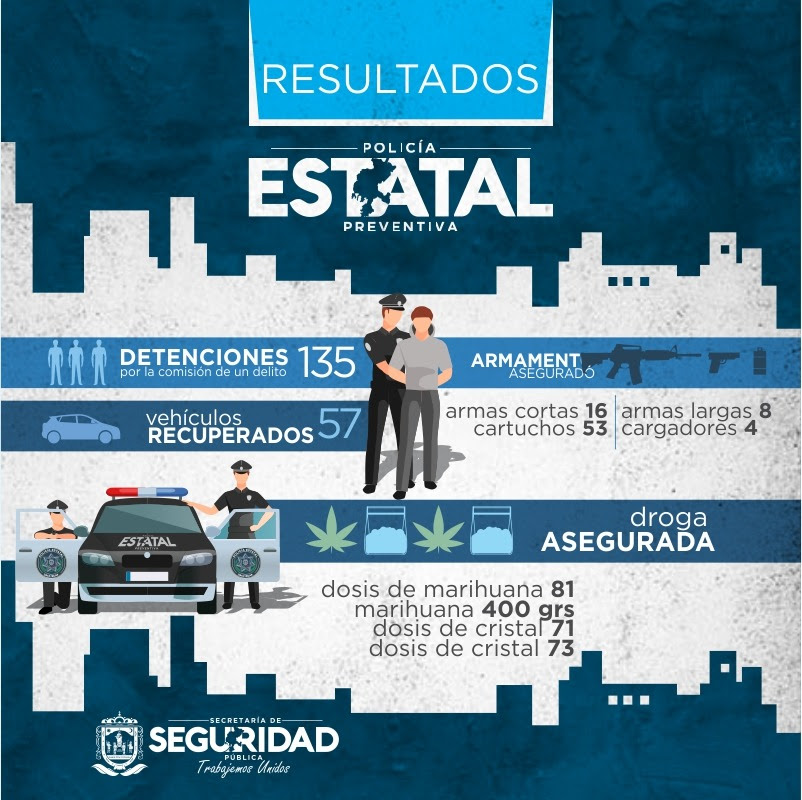 En lo correspondiente a la Secretaría de Seguridad Pública (SSP), en febrero, la Policía Estatal Preventiva (PEP) logró la detención de 135 personas, 67 por incurrir en faltas administrativas, 46 por la probable comisión de delitos del fuero común y 22 más por cometer delitos del orden federal.
