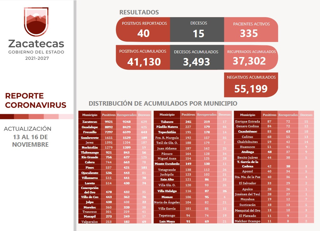 Tres de estas personas se encuentran graves y el resto está enfrentando el virus en sus domicilios. En 24 casos el contagio fue comunitario y en 16 fue por contacto con otro positivo. Zacatecas suma, a la fecha, 41 mil 130 casos positivos.