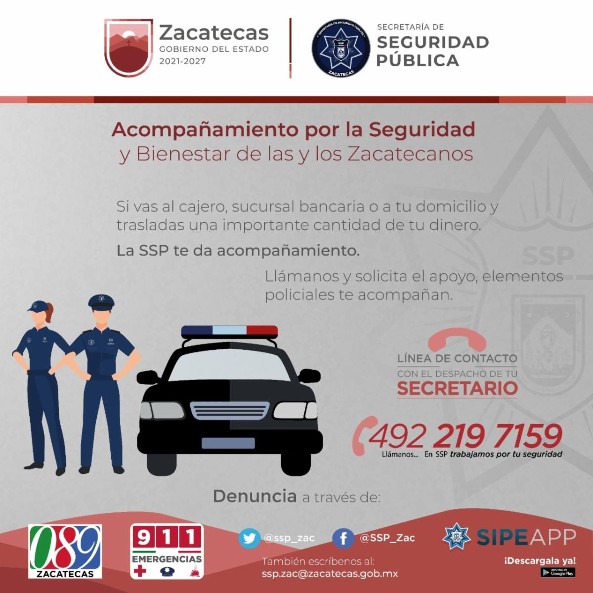 En el marco del programa de Acompañamiento y Bienestar por las y los zacatecanos, que implementó el Gobernador David Monreal Ávila, integrantes de las corporaciones de la Secretaría de Seguridad Pública (SSP) brindan acompañamiento a cuentahabientes para que realicen retiros y traslados de grandes cantidades de dinero de manera segura.