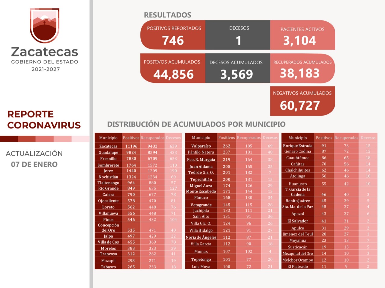 En su reporte estadístico de este día, las autoridades de salud también registraron un fallecimiento, así como ocho pacientes recuperados en distintos municipios del territorio zacatecano.