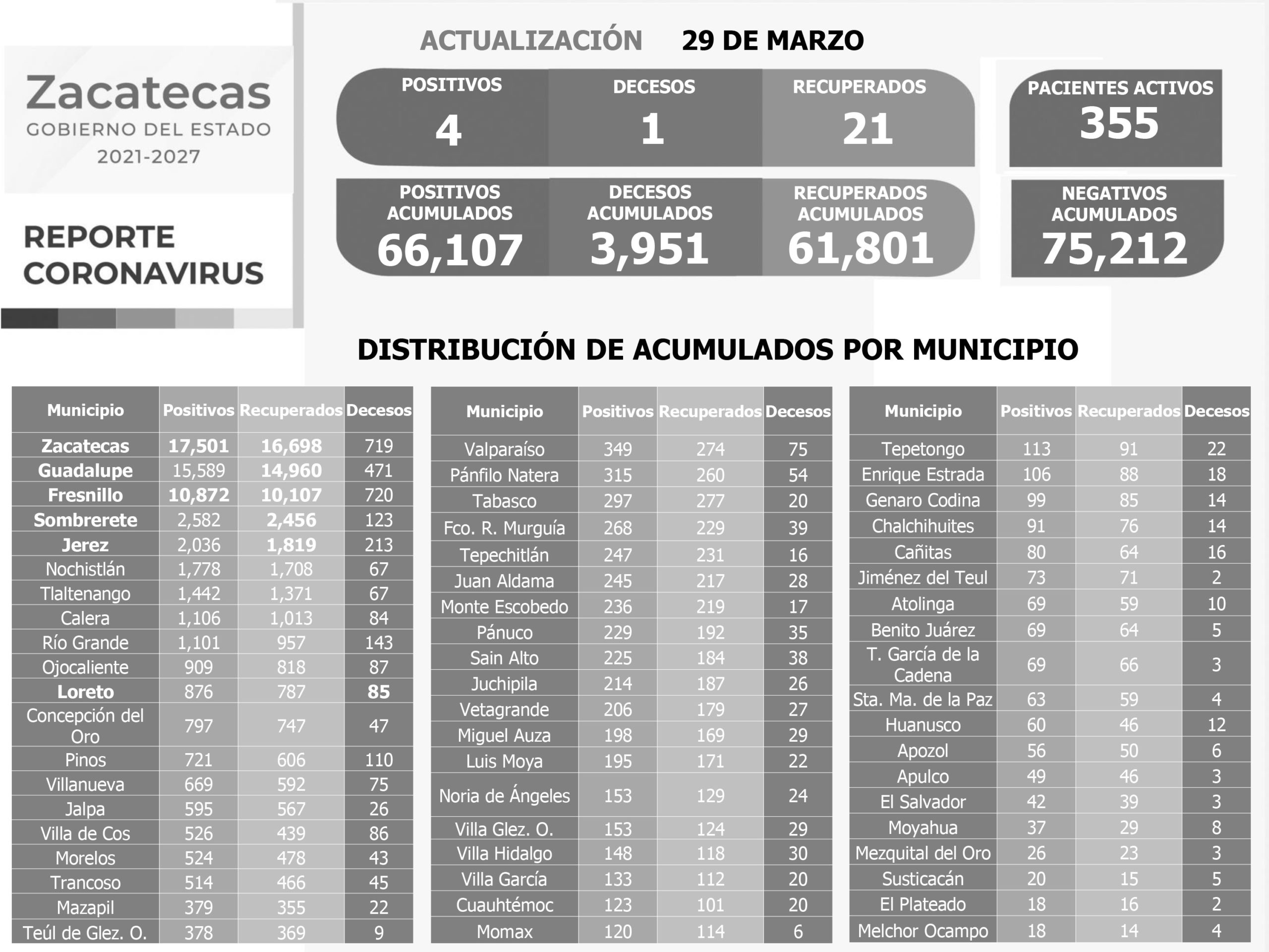 A la fecha, Zacatecas tiene 66 mil 107 casos positivos confirmados y 3 mil 951 fallecimientos por la enfermedad que ha causado la pandemia.