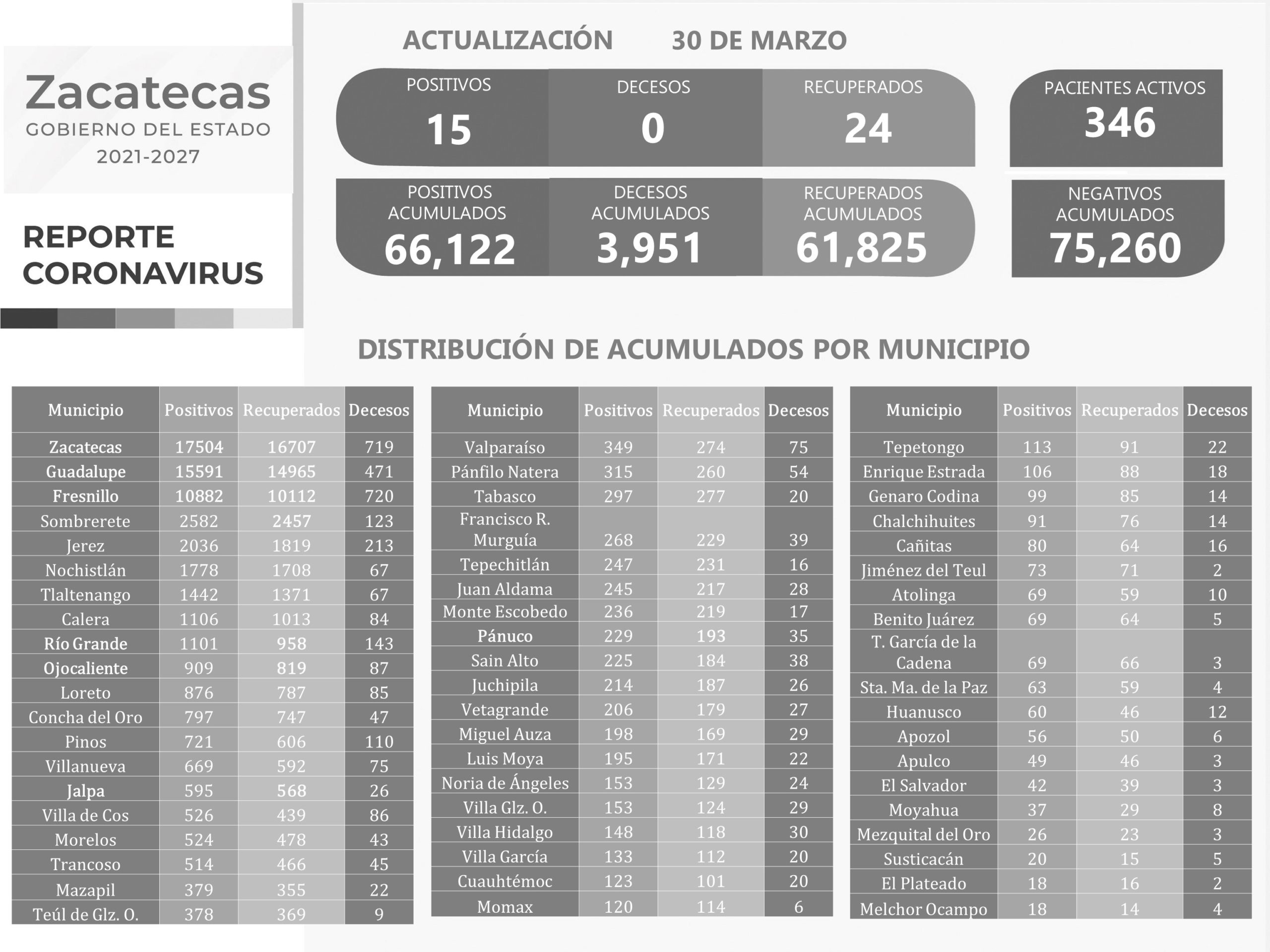 En esta ocasión, quienes dejaron atrás el SarsCoV2 son 14 hombres y 10 mujeres. El mayor número (7) tienen de 23 a 29 años; seis, entre 30 a 36; cuatro, entre 43 a 48, el mismo número que de 2 a 12; dos, entre 71 y 72, y uno, tiene 57. Sus domicilios están en Zacatecas (9), Fresnillo (5), Guadalupe (5), Jalpa, Ojocaliente, Pánuco, Río Grande y Sombrerete.