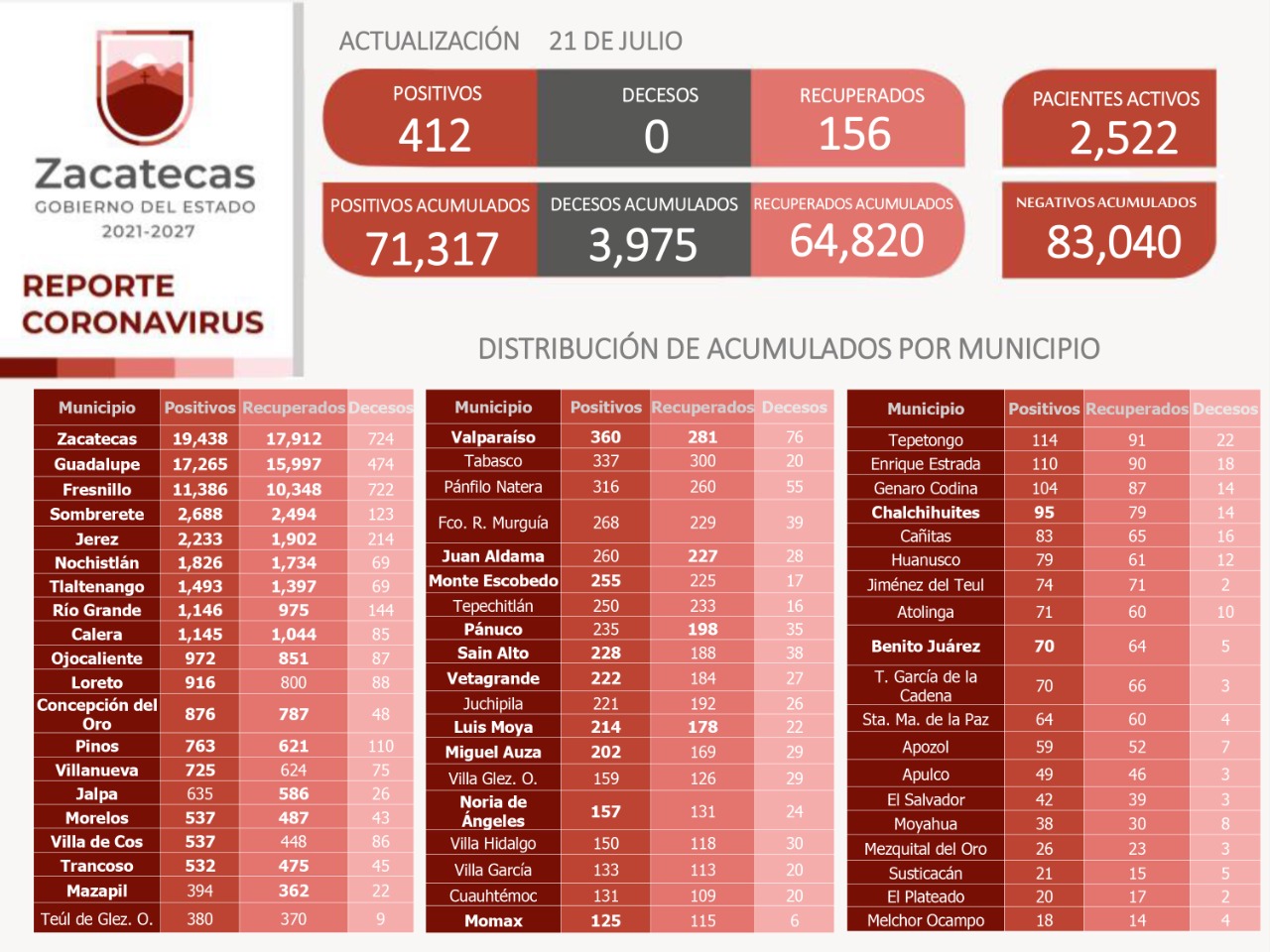 Los contagios ocurrieron en Guadalupe (119), Zacatecas (116), Fresnillo (76), Sombrerete (22), Concepción del Oro, Calera, Chalchihuites, Florencia, Jerez, Loreto, Luis Moya, Miguel Auza, Momax, Monte Escobedo, Morelos, Nochistlán, Noria de Ángeles, Ojocaliente, Pinos, Río Grande, Sain Alto, Tlaltenango, Trancoso, Valparaíso, Vetagrande y Villanueva.