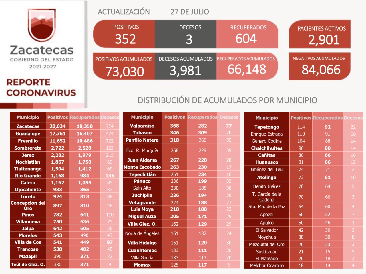 El acumulado total de casos confirmados es de 73 mil 030. En esta ocasión, el municipio de Zacatecas reportó 129, Guadalupe 108 y Fresnillo 39, los demás se encuentran en: Concepción del Oro, Calera, Jalpa, Jerez, Juan Aldama, Juchipila, Loreto, Luis Moya, Miguel Auza, Monte Escobedo, Morelos, Nochistlán, Ojocaliente, Pánfilo Natera, Pinos, Río Grande, Sombrerete, Tlaltenango, Tabasco, Trancoso, Valparaíso, Villa de Cos y Villanueva.