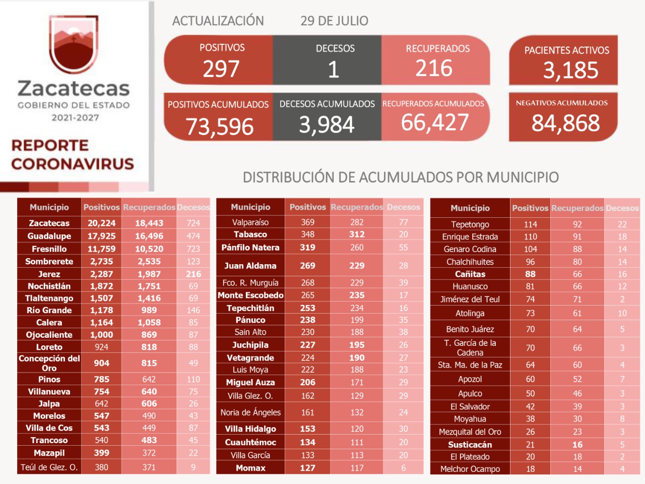 Este viernes, la Secretaría de Salud de Zacatecas (SSZ) dio cuenta de 297 nuevos casos positivos de COVID-19, de la recuperación de 216 personas y de una defunción relacionada con la enfermedad.