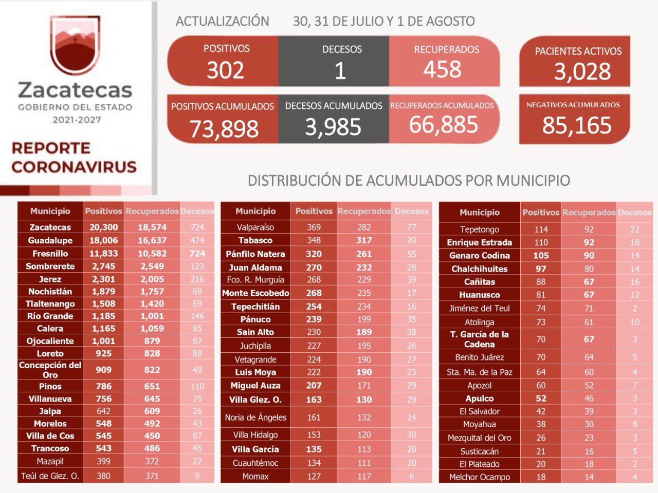 Una niña de 5 meses de edad, habitante de Guadalupe, es la persona más joven entre las que la Secretaría de Salud de Zacatecas (SSZ) reportó como libres del virus SARS-CoV-2. En total, del 30 de julio al 1 de agosto, son 458 las personas en esta condición, 302 los casos positivos de Covid-19 y un fallecimiento relacionado con la enfermedad.
