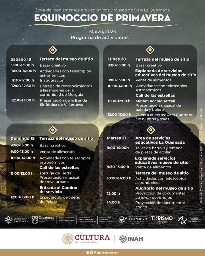 Del 18 al 21 de marzo, la zona arqueológica de La Quemada, en Villanueva, al igual que Alta Vista, en el Pueblo Mágico de Teúl de González Ortega, y Las Ventanas, en el municipio de Juchipila, ofrecerán diversas actividades con motivo del equinoccio de primavera.