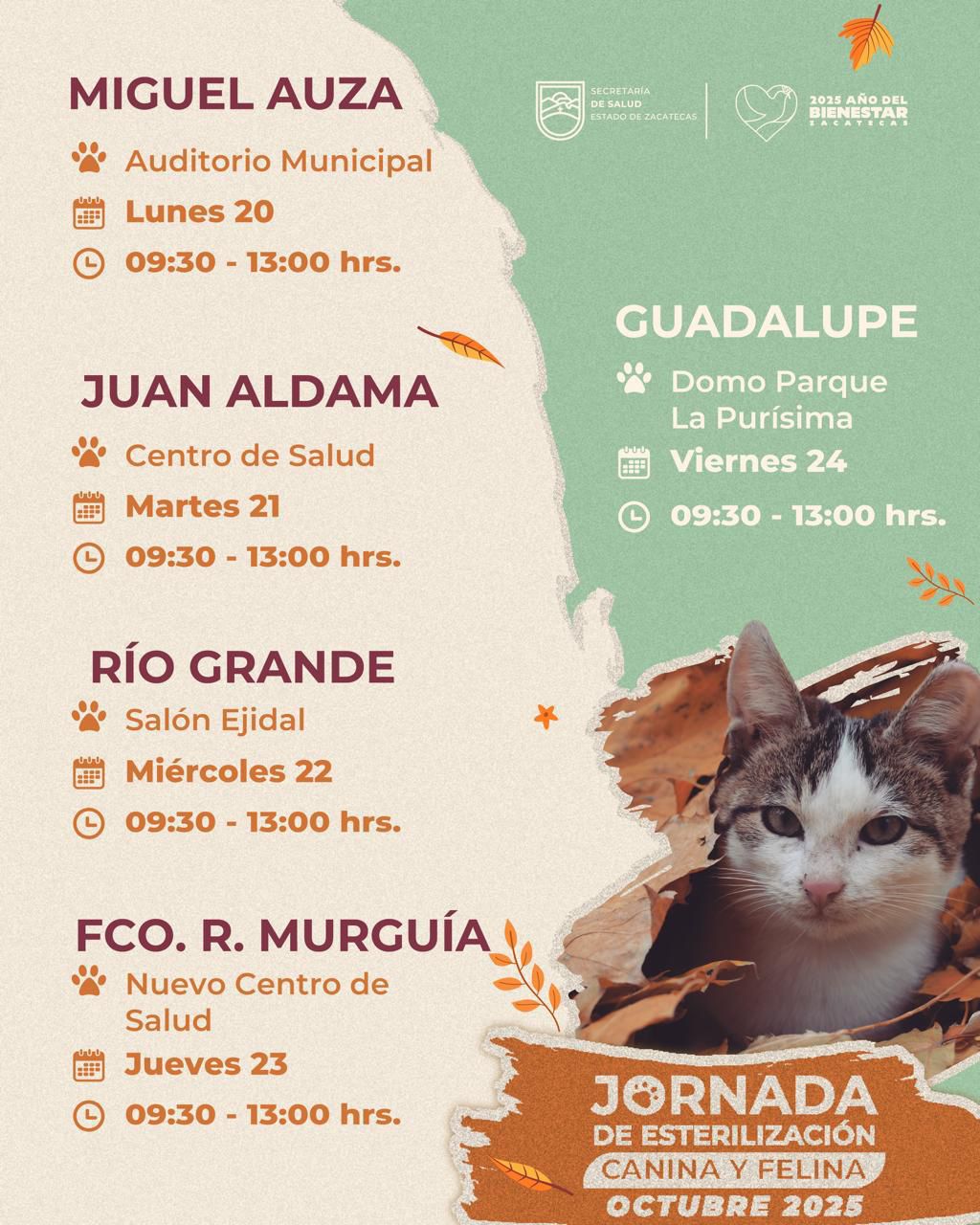 El lunes 20, el módulo se habilitará en el Auditorio Municipal de Miguel Auza; el martes 21, en el Centro de Salud de Juan Aldama; mientras que el miércoles 22, la cita será en el Auditorio Municipal de Luis Moya; durante el jueves 23, los procedimientos se ofrecerán en el Salón Ejidal de Río Grande, para cerrar las actividades semanales el viernes 24, en el domo del Parque La Purísima, de Guadalupe.