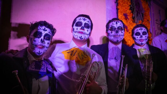 En un gesto de cercanía, esqueletos de gran tamaño se asoman por los balcones de las casonas antiguas y saludan a la gente; la Catrina sonriente, rodeada de flores de papel brillante, parece haber regresado un rato a su antiguo hogar.