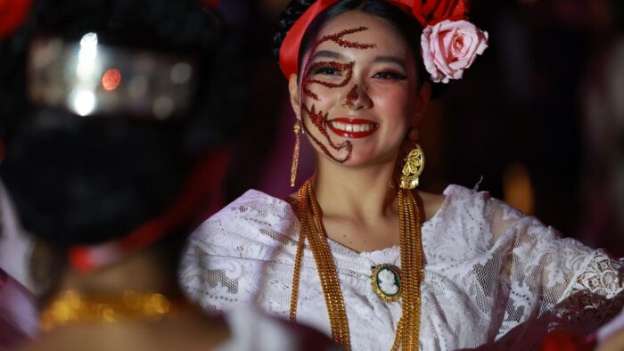Y el recorrido siguió con figuras imponentes, como la Catrina en su vestido blanco, otras con sombreros anchos y velos, que rinden tributo a la elegancia del folclor mexicano.