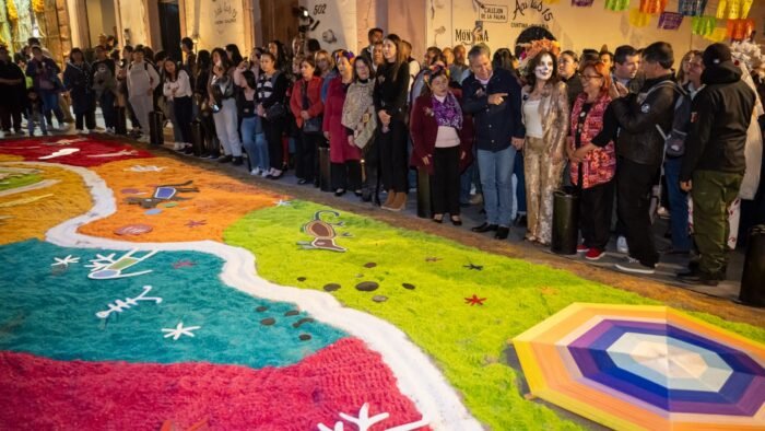 El suelo se ha convertido en un lienzo, vestido de tapetes monumentales de aserrín teñido, con calaveras de grandes ojos florales, con lo que crean un sendero vibrante y efímero que guía el recorrido de los vivos y el retorno de los muertos.