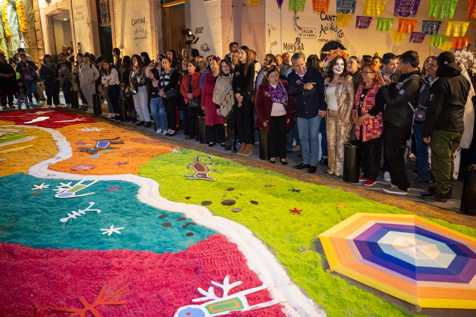 El suelo se ha convertido en un lienzo, vestido de tapetes monumentales de aserrín teñido, con calaveras de grandes ojos florales, con lo que crean un sendero vibrante y efímero que guía el recorrido de los vivos y el retorno de los muertos.